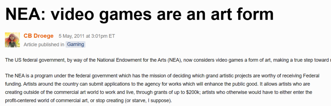 但不论源头如何、排第九是否准确,现在“电子游戏是一门艺术”应该已经成为了一种“共同认知”,这不仅是游戏业的自我标榜或来自玩家的呼声,学界也有不少文献对此进行理论验证。海外一些国家甚至有过官方界定,如美国联邦政府直属组织美国艺术基金会(NEA)就在2011年发文宣布将电子游戏纳入艺术范畴。