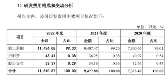 有意思的是,观察衡泰技术的研发费用明细,主要是由职工薪酬、折旧费、股份支付构成,其中职工薪酬的金额分别为7300.66万元、9407.47万元、11434.08万元,分别占当期研发费用总额的99.01%、99.26%、99.33%,这也意味着,衡泰技术的研发费用就是给员工发工资。这就不禁令人感到疑惑,衡泰技术的研发水平难道就是靠员工“闭门造车”,不需要依靠其他外部的原材料等“工具”?![]()