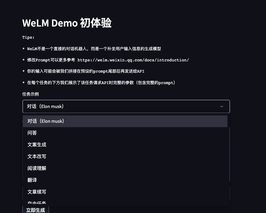 事实上,腾讯在AI大语言模型上的储备并非不足,早在ChatGPT正式发布前的2022年10月,微信的大语言模型「WeLM」(WeChat Language Model))就已经上线,只不过这不是一个直接的对话机器人,而是一个补全用户输入信息的生成模型。