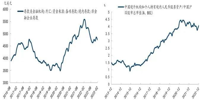 图6:中国企业美元储及境外机构及个人持有股票占AB股市值比例