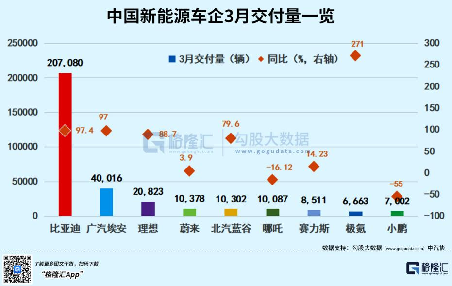 3月的交付量,除了比亚迪和广汽埃安,理想3月份发布了L7逐渐发力,销量最终站上了两万辆,而小鹏在经历了人事变动后,3月推出了P7i目前还未看到曙光。