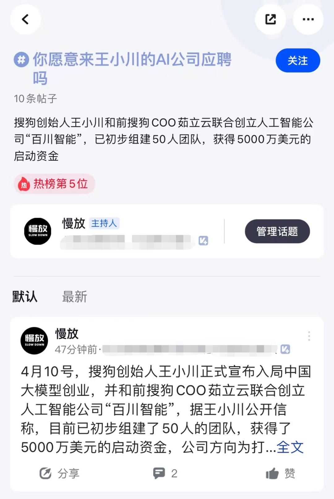 「慢放」在脉脉发起的“你愿意来王小川的AI公司应聘吗”这一话题中,程序员“嚣张的贝莎在上网课”就表示,“百川智能肯定是大佬云集,估计年薪百万都是级别兜底,要是有幸能加入这样的团队,估计财富自由是稳了,好想加入”。从此不难看出职场人对于AI创业潮流下高薪机会的期待。