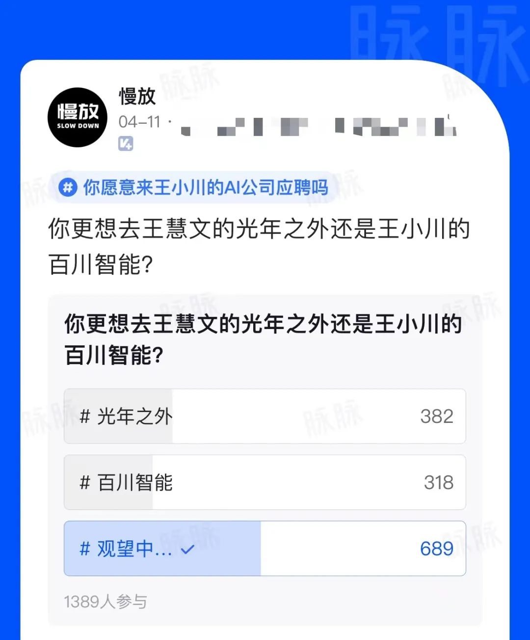 从另一个角度看,或许职场人对AI的理性态度,也让大家或许没有那么急于投身AI大潮。「慢放」在脉脉发起的“你愿意来王小川的AI公司应聘吗”话题的调查结果显示,相比于想去光年之外,还是想去百川智能,有约50%的投票选择了“观望中”。
