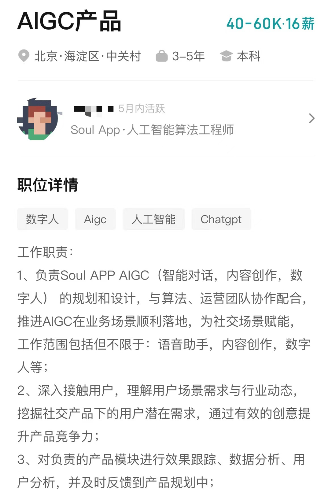 在BOSS直聘搜索“人工智能工程师”,AIGC工程师相关职位薪资多在30-60K、15薪这一区间,今日头条开出了40-70K、15薪招募“AIGC技术专家”,最高年薪达105万元;Soul开出了40-60K、16薪招募“AIGC产品”,最高年薪达96万元。