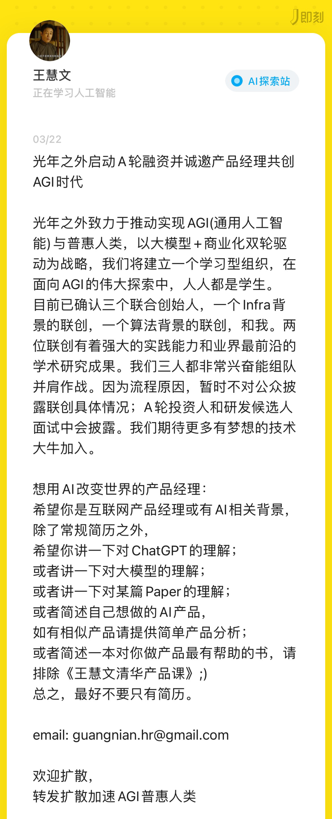 2月13日,曾任美团联合创始人、已退休两年的王慧文带着“AI英雄榜”的招聘贴重回大众视野,称要“打造中国OpenAI”。据“AI英雄帖”的内容,王慧文要出资5000万美元设立北京光年之外科技有限公司(以下简称“光年之外”),公司估值2亿美元。王慧文不占股份,资金占股25%,75%的股份用于邀请顶级研发人才。