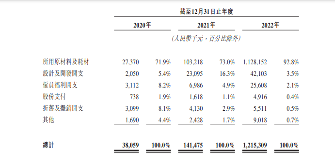 钛媒体APP注意到,在芯片等技术方面依赖于外部的知行科技,成本支出也急速推高。知行科技供应商主要包括原材料及零部件供应商,包括车规级芯片、机械部件、光学部件及电气部件的供应商。数据显示,知行科技的收入成本由2021年的1.41亿元大幅增加至2022年的12.15亿元,其中所用原材料及耗材占比为92.8%。所用原材料及耗材增幅明显超过同期收入增幅,这也导致知行科技毛利率偏低。
