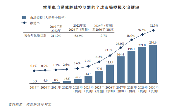 弗若斯特沙利文数据显示,全球自动驾驶域控制器的市场规模由2019年的5亿元增长至2022年的165亿元,复合年化增长率为211.2%,预计2026年将达到1154亿元,复合年化增长率为62.6%。随着市场扩张,乘用车自动驾驶域控制器的渗透率由2019年的0.1%上升至2022年的2.6%,预计于2026年及2030年将分别达到23.8%及62.7%。