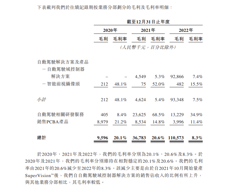 对此,知行科技在招股书中解释称,自2021年10月开始量产SuperVision后,自动驾驶域控制器解决方案的销售占收入的比例有所上升,与其他业务分部相比,其毛利率较低。