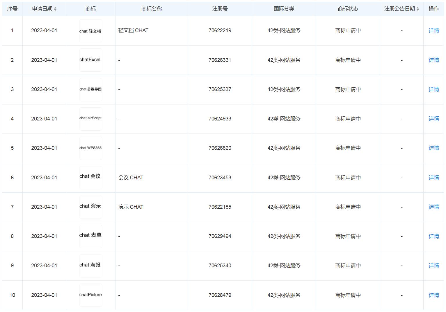 天眼查App显示,近日,北京金山办公软件股份有限公司申请注册多个“chat 会议”“chat 演示”“chat 表单”“chat Office”“chat everything”等商标,国际分类为网站服务,当前商标状态均为申请中。