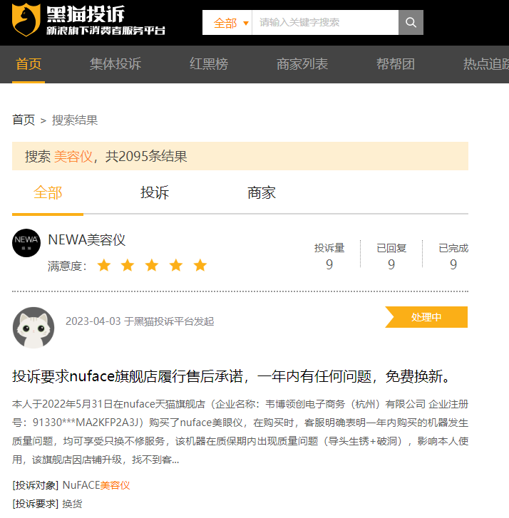 近几年家用美容仪行业确实发展迅猛,但行业背后的投诉和批评声同样是不绝于耳。在黑猫投诉平台上搜索“美容仪”,出现2091条投诉结果,其中有大部分都与产品质量有关。有用户反馈美容仪使用一阵子突然就坏了,商家却不提供相应的保修服务。也有很多用户投诉,产品美容效果没达到,反而对皮肤造成其他损伤,美容仪变成“毁容仪”。
