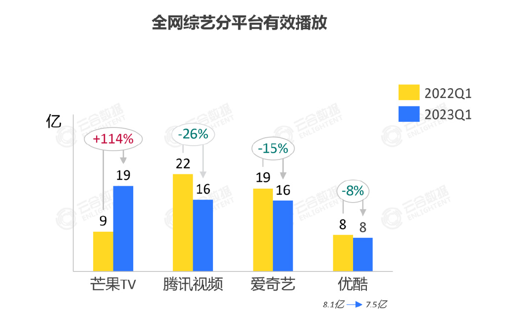 这种久违的提振所带来的乐观情绪,透过Q1的数据更容易理解。云合数据显示,2023年Q1全网综艺累计正片有效播放为60亿,同比上涨3%。但需要知道的是,这是建立在去年同期同比下滑33%的基础上。换言之,综艺市场仍在持续低迷,盛景难现。
