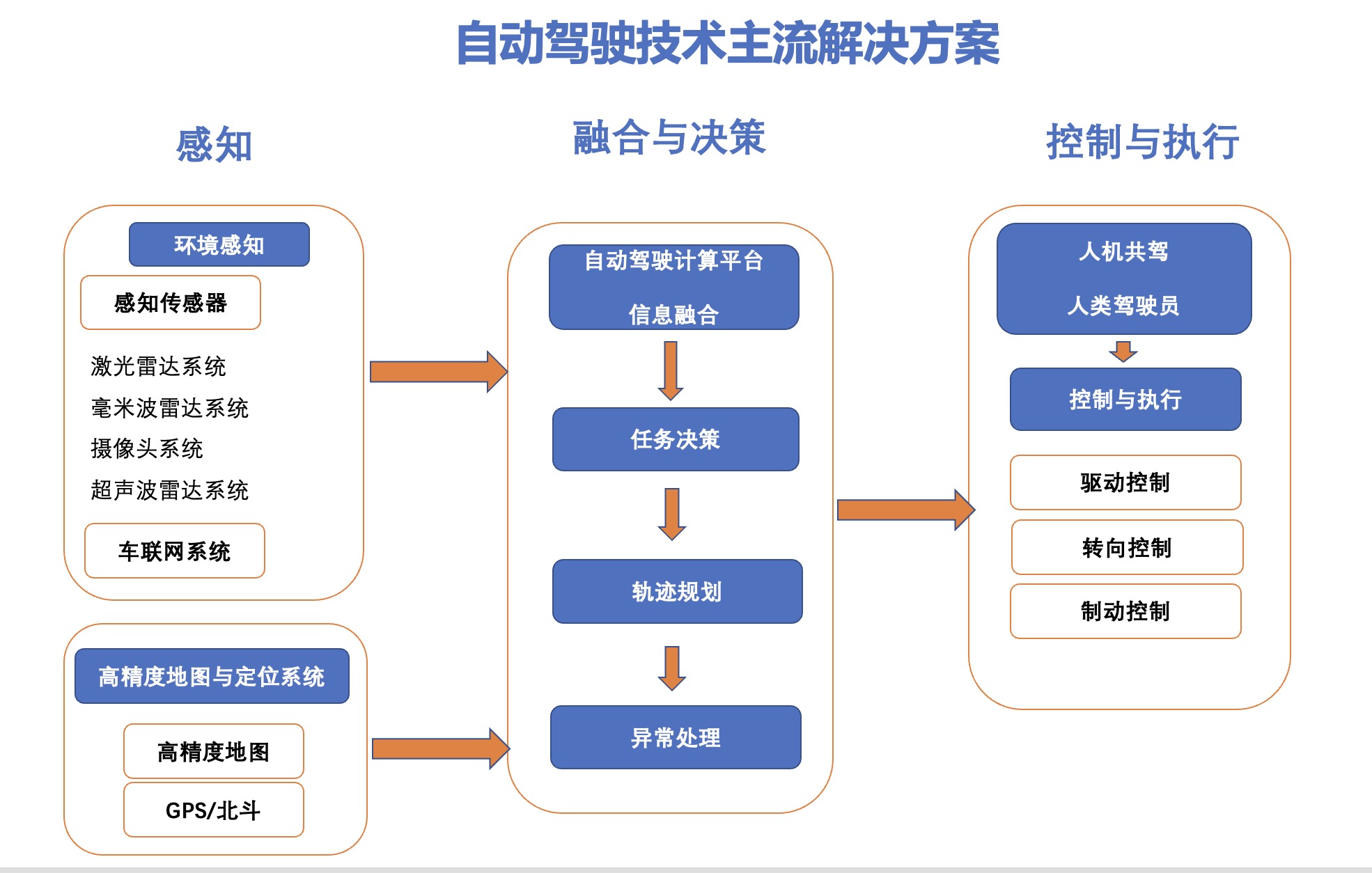 L3算是一种过渡形态,L5过于遥远,市面上的自动驾驶公司基本以L4作为主流解决方案。下图展示了L4一级自动驾驶解决方案路径。
