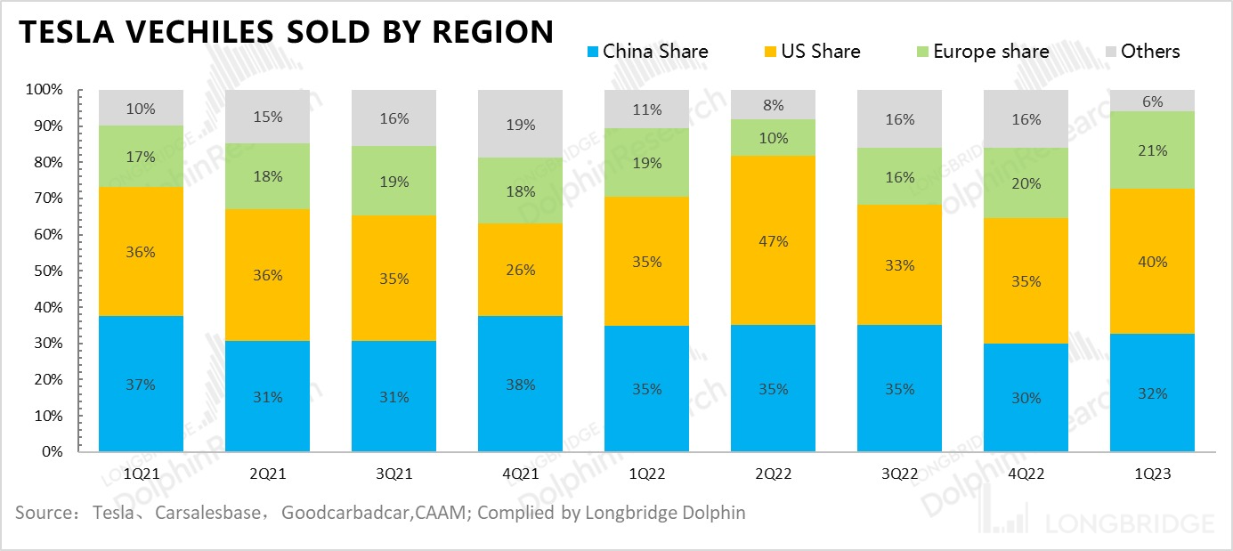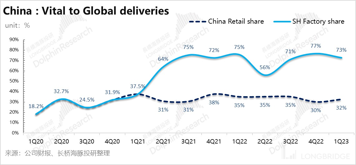 b. 中国市场作为特斯拉的绝对生产中心和主要销售地区之一,四季度特斯拉全球销量中,77% 是上海工厂来支撑,再次创下历史新高,而这大概率也是中国工厂能够贡献了最高点了,因为在规划上上海工厂不会再扩产了。