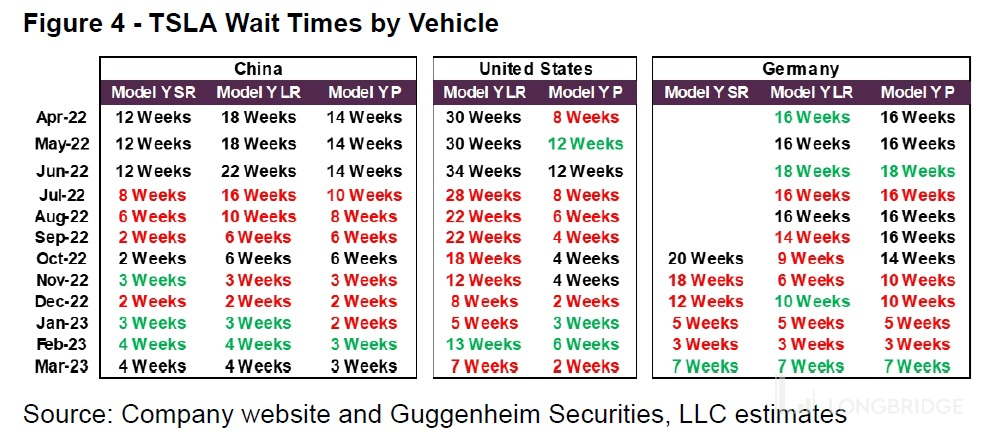 a. 一般来说提车周期四个月是正常时间,因为现车从工厂到门店到消费者手中,基本就是需要一个月左右的时间,2-3 周的提车时间大概率现货库存过于充分了。一季度期初,特斯拉降价释放销量时候,提车等待时间明显拉长,尤其是美国,但走到三月份,部分地区和车型的提车时间已经回归正常。