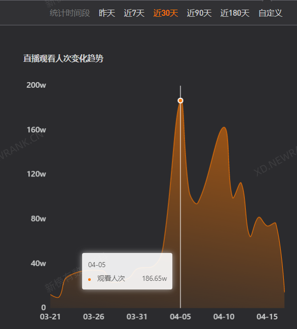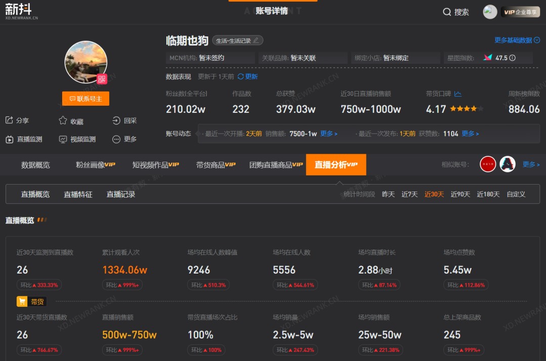 也狗在3月便马不停蹄地开启了直播带货,亲自下场做直播。新抖数据显示,“临期也狗”在3月13日场观仅有12万,随着账号粉丝暴涨,4月5日的场观最高超过了186万。