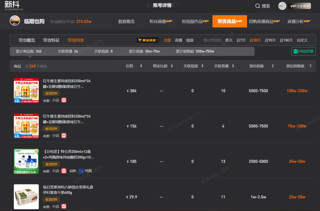 在货盘上,二人视频中揭秘过的产品赫然在列。新抖数据显示,“临期也狗”和“尖商胖丁”销量最高的三款产品均为红牛、牛奶和每日坚果,在二人合力之下,红牛的预估销售额超过250万。