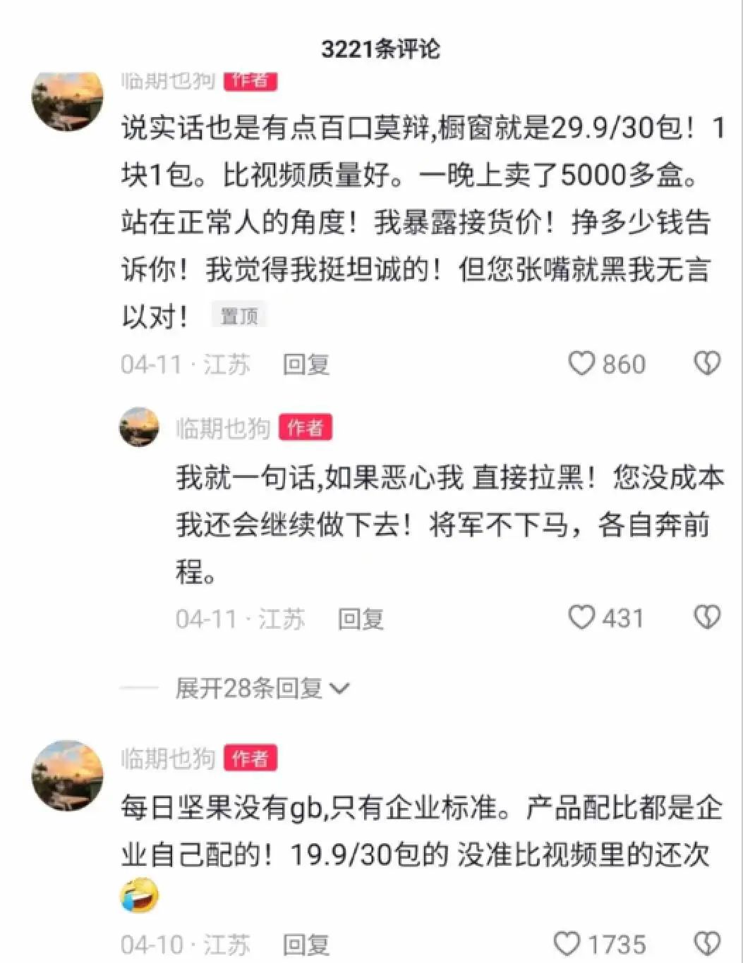 对此,也狗回应道,橱窗售卖的29.9元30包的每日坚果比视频中“用果干充数、坚果多为半颗”的质量好,一块钱一包一晚卖了5000多盒,还透露每日坚果的产品配比都是企业自己配的,更便宜的产品质量比视频中展示的还差。