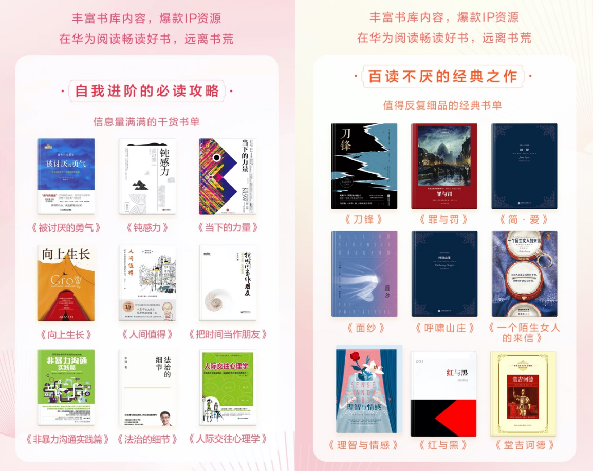 内容端,截至目前,华为阅读已经与中信出版社、人民邮电出版社、上海译文出版社、阅文、掌阅等出版社和内容伙伴,以及喜马拉雅、蜻蜓FM、樊登读书等有声内容平台达成合作。