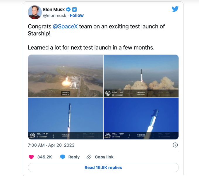 美国宇航局局长Bill·Nelson在今日星舰发射后的一份声明中表示:“历史上的每一项伟大成就都需要一定程度的风险计算,因为风险越大,回报越大。” “期待SpaceX下一次的星舰飞行测试,以及更远的未来。”