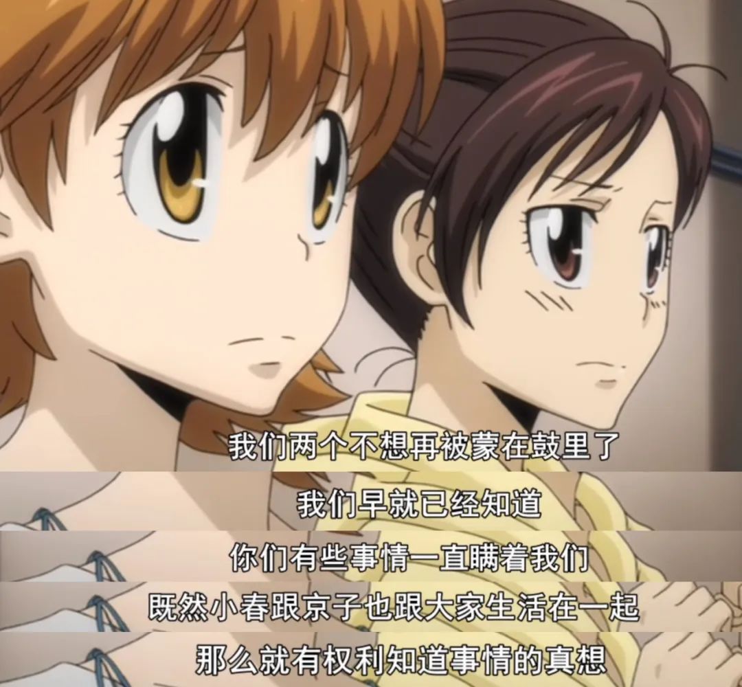 《家庭教师reborn》的前期剧情中,男主沢田纲吉爱慕笹川京子,但和京子的兄长了平不约而同地选择了隐瞒京子关于自己所接触的“黑手党生活”,甚至在京子和小春被卷入时空旅行、穿越到危险的十年后世界后,仍然没有告诉她们“世界的真相”。只是女性作者天野明主动打破了这种信息差,在未来篇后期设计让两个女性主动反抗,主角团才老实地道出了黑手党身份和穿越到十年后的原因。