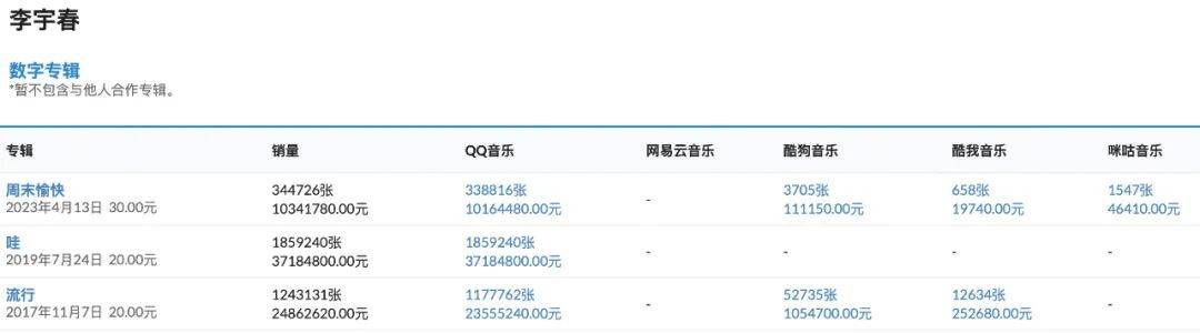 李宇春《周末愉快》这次卖了34万多张,战报的宣发话术用的是「25分钟销量突破10万张」、「2023年最快突破三白金唱片记录」,乍看之下好像卖得还OK。但要知道,过往的李宇春数专可全部都是卖过了100万张。(如上表,19年《哇》卖了约185万张,17年《流行》卖了约124万张)