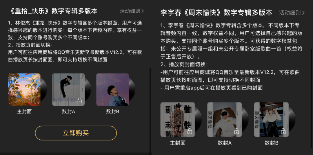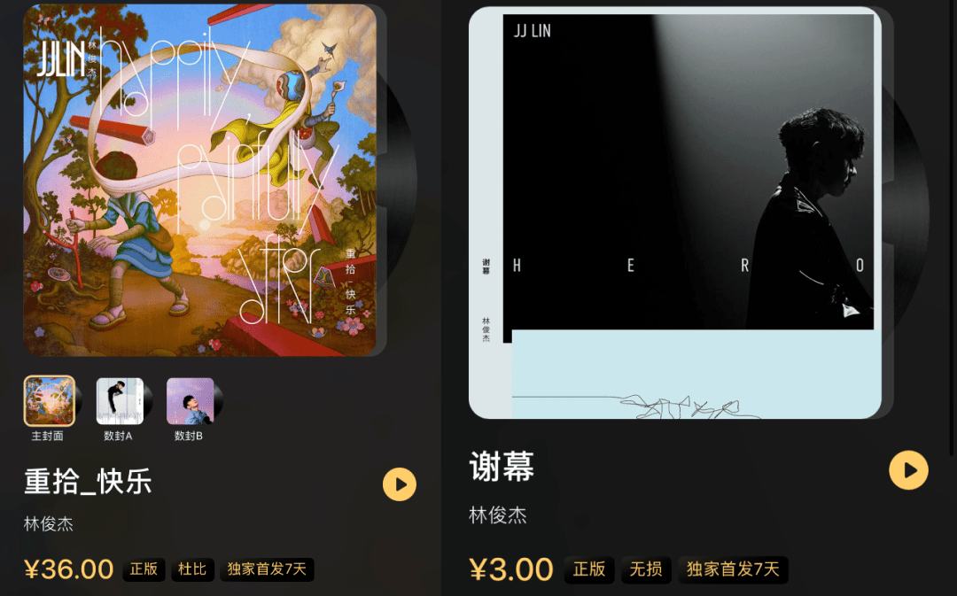 举例来说,这次《重拾_快乐》数专其实含有三个版本,三版本的唯一区别在于“皮肤”(专辑封面)不同,主封面版是油画,数封A、数封B分别是JJ不同造型艺术照,而想要拥有三版专辑你就要掏出三个36元。