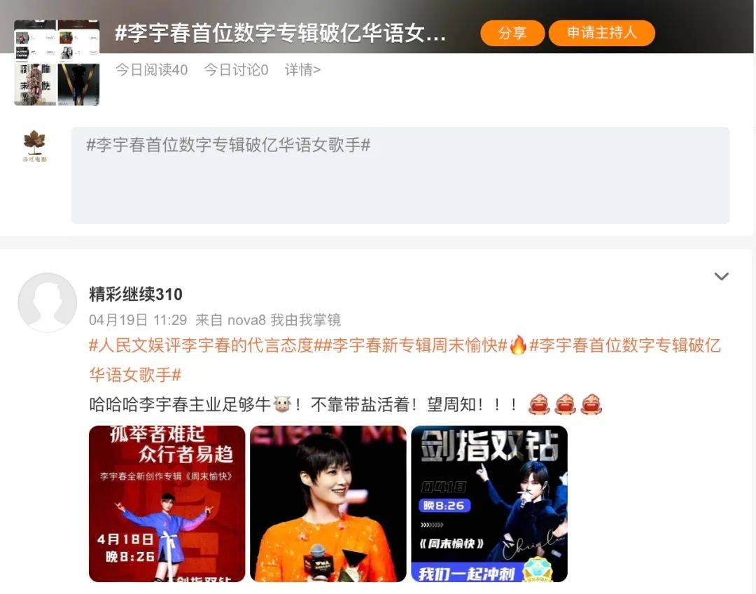不得不说,李宇春公司是懂宣发的,估计她团队也明白这次销量并不理想,开始搬出历史数据变着法子吹战报,想出了「首位单平台数字专辑破亿女歌手」、「首位全平台数字专辑破亿华语女歌手」等宣传噱头。真可谓是:今年销量不够,搬出历史来凑。