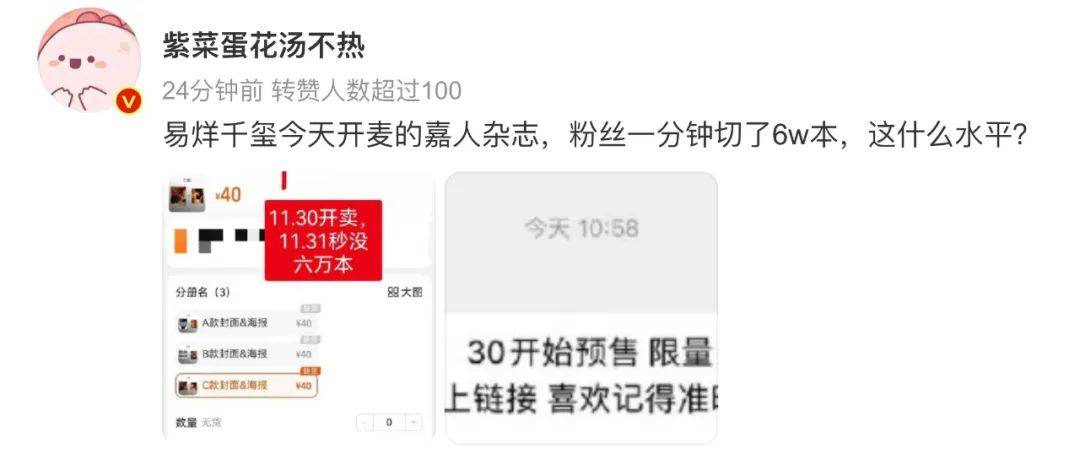 再者,最近的一系列新动态都在传递利好信号。一来,21日 #易烊千玺嘉人# 的话题登上热搜,而这本独家揭露了《刘艳芬》创作幕后的杂志在1分钟内售罄6万本,火爆卖相可看作是新专销售的预演。