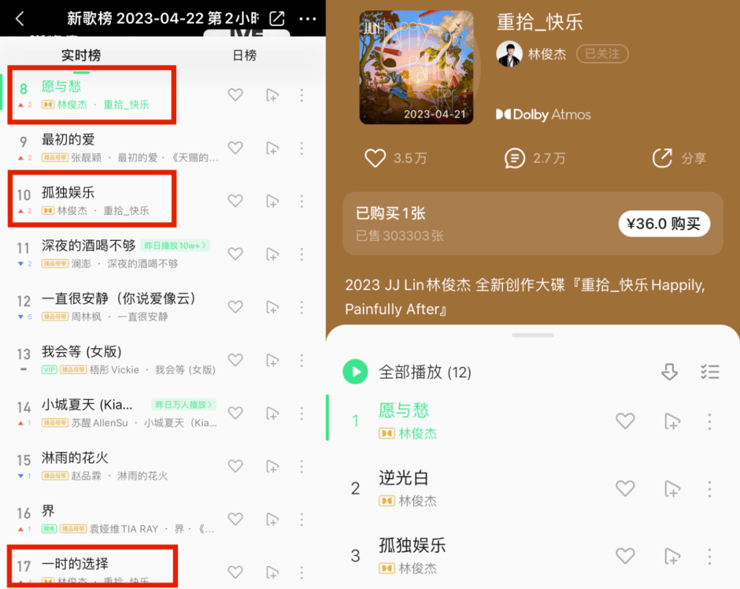 尽管JJ这张新专共收录12首歌,一首歌3块的定价看似也合情合理,但36块确实是很多人犹豫掏不掏钱的临界点。而且,JJ这次的12首歌里还包含《谢幕》《7千3百多天》等好几首此前就公开了的“老歌”,有很多人也会考量到新歌太少而放弃购买。