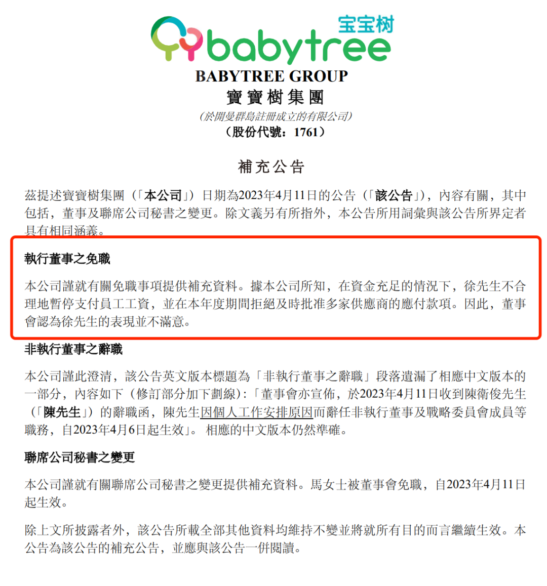 4月17日,宝宝树又接着发布《补充公告》,称徐翀曾在资金充足的情况下,不合理地暂停支付员工工资,并在本年度期间拒绝及时批准多家供应商的应付款项。“因此,董事会认为徐先生的表现并不满意。”