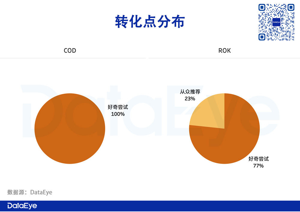 ROK:转化点总体多样性不强,但多于《万龙觉醒》。约23%分布在【从众推荐】中,其余77%为【好奇尝试】。