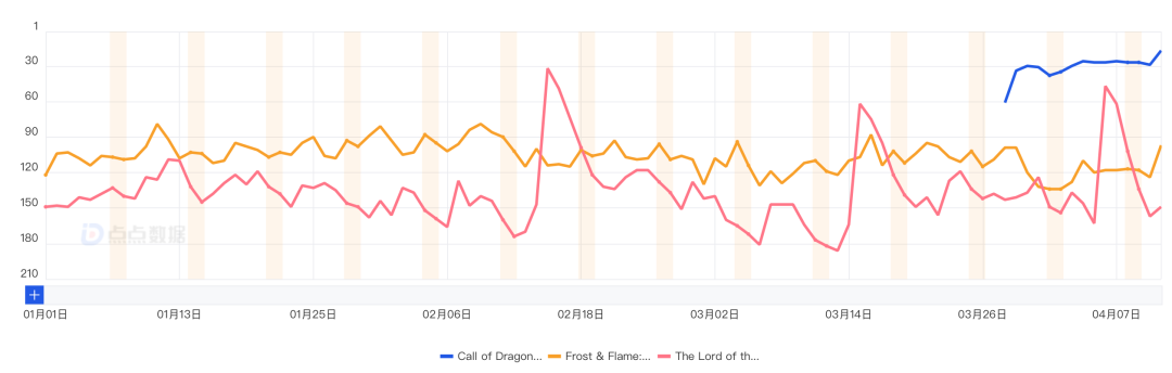 对比另外两款出海魔幻SLG来看,截至4月21号,美国市场的iOS畅销榜上,《万龙觉醒》(蓝)暂时领先于FunPlus的《阿瓦隆之王》(黄)、网易《指环王》(红)。当然,后两款游戏上线时间更久,而《万龙觉醒》是新游上线,有一波红利,下图不能说明《万龙觉醒》更好,反而说明《阿瓦隆之王》《指环王》表现稳健,畅销榜地位没被撼动。