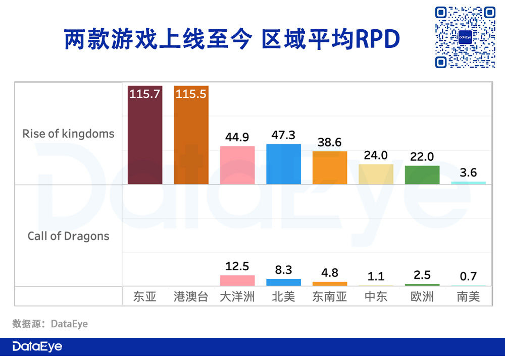 《万龙觉醒》上线至今RPD区域表现:大洋洲表现最佳,其他地区RPD<10美金。