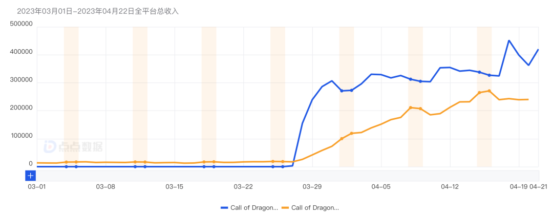 点点数据显示,截至4月21号,《万龙觉醒》于苹果端(蓝线)、谷歌端(橙线)全球预估累计收入分别为5563万人民币和3148万人民币,合计约8700万人民币。该游戏在全球各市场iOS畅销榜都表现突出。