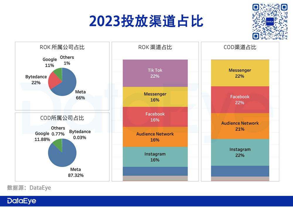 《万龙觉醒》(COD)主打Meta&Google,各媒体占比相对平均。ROK:在Tik Tok上投放了较高的预算。其余平均。