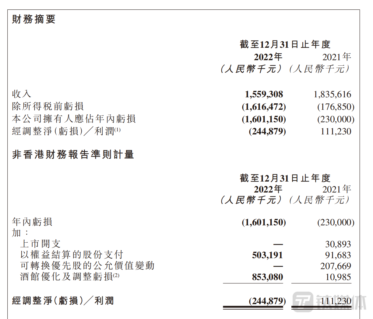 其次,是业绩亏损。据海伦司2022年年报数据,报告期内,公司收入为15.59亿元,同比减少15.05%;公司拥有人股东应占年度亏损为16.01亿元,去年同期为2.3亿元,亏损数额近乎8倍。其中,酒馆优化及调整亏损就高达8.53亿元。