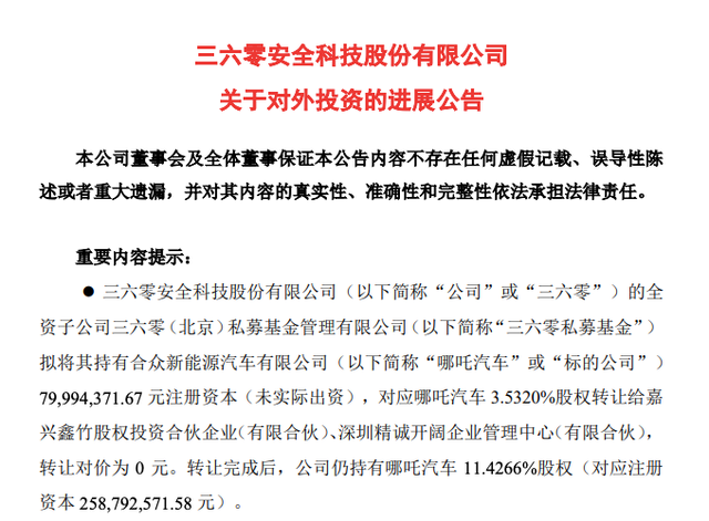 360宣布放弃增资哪吒汽车,图源360公告