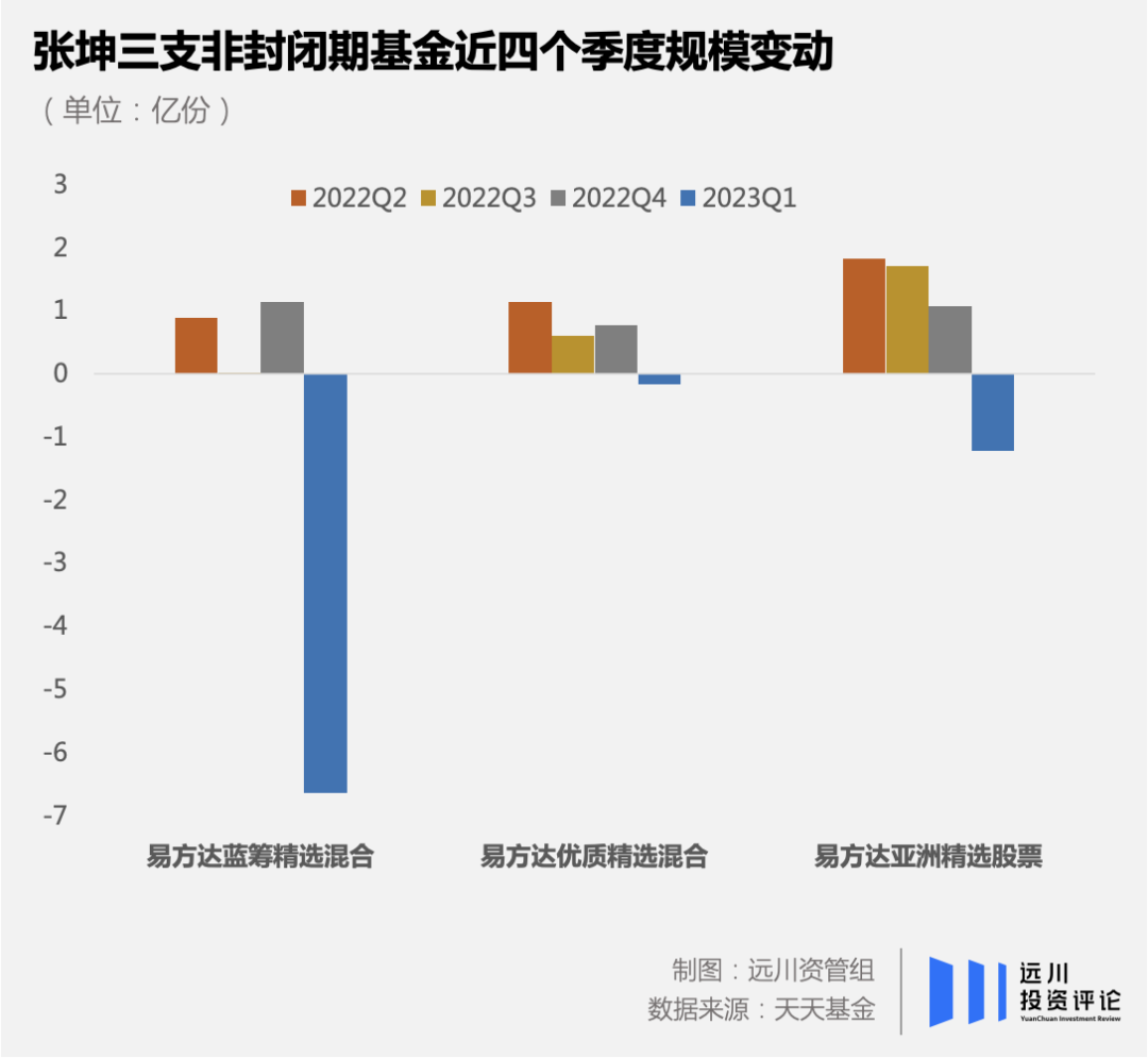 4月21日一季报落地,张坤管理的四只基金一季度报显示,除了仍处于封闭期的易方达优质企业三年持有期外,其余三只基金在连续三个季度的净申购之后,出现了净赎回。