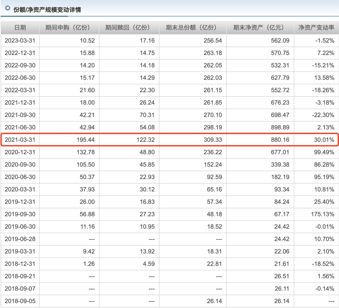 限购本身是一种保护投资者的方式,委婉地提示人们「现在少买或者别买」,但这种对规模的克制放在当时狂热追逐明星基金经理的市场情绪下,效果却十分有限——整个2021年一季度易方达蓝筹精选申购份额合计195.44亿份,总份额来到309.33亿份,均为产品成立至今的最高值。
