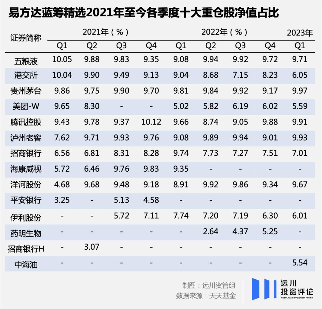 两年间,共有14支股票登上过易方达蓝筹精选定期报告的前十大重仓,除了调整过美团、平安银行、药明生物、海康威视和招行的H股外,2021年三季度伊利开始进入重仓,今年一季度新增重仓股中海油之外,张坤的重仓组合并没有因为自己管理规模的变化而产生明显波动。