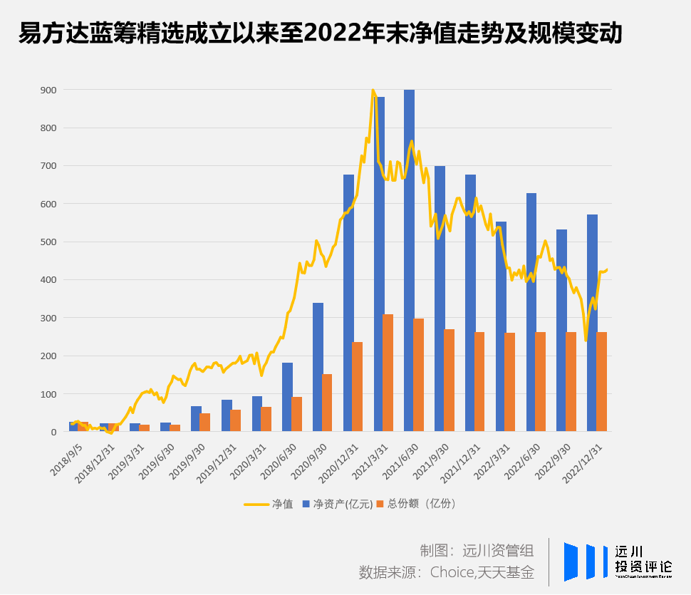 这种非常巴菲特的表述方式,在狂热的市场情绪面前,似乎并没有起到明显的效果。随着核心资产泡沫化的过程里基金净值也跟着一起飙升,2020年6月至9月的一个季度里,易方达蓝筹精选的总份额翻倍。