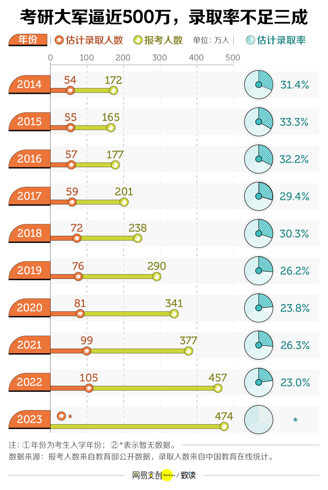 根据教育部数据,2023 考研人数 474万,而 2022 年毕业本专科生为 967.3 万人 [11],近乎一半的毕业生都加入考研队伍。虽然比去年增长势头有所放缓,但要知道,三年前这一数字还只有 341 万 [12]。