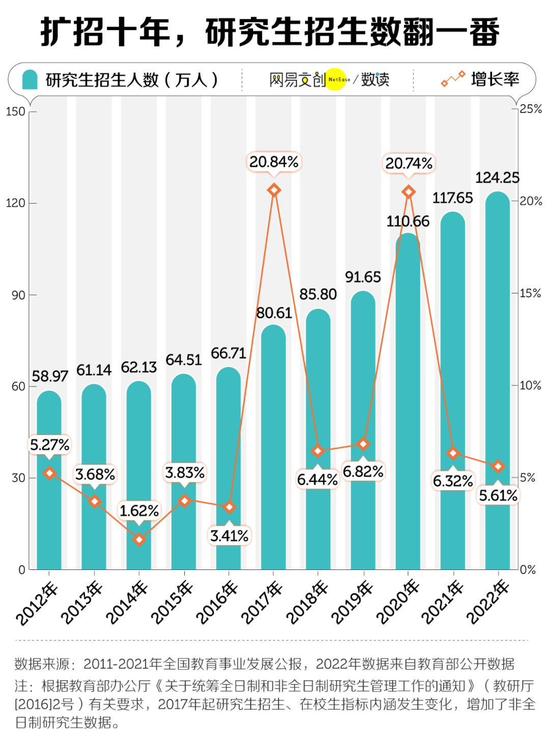 这两年,扩招更是进入了快车道,2020 年的招生人数突破百万大关,增长率达到了 20.74% [7] 。去年招生人数达到 124.25 万人,比十年前整整翻了一番 [8]。