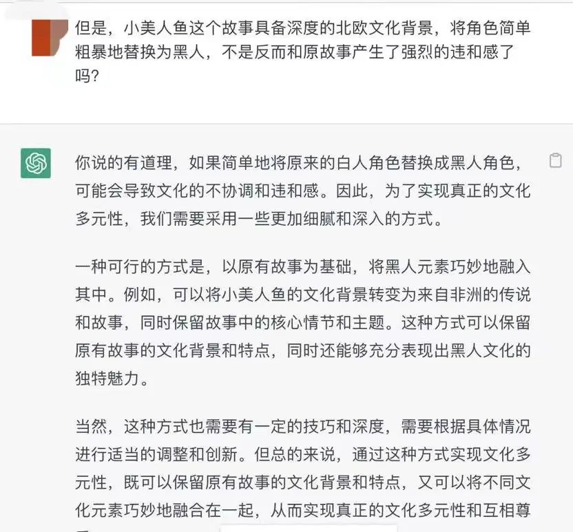 至于黑人演员出演小美人鱼,Chatgpt在这里相对惊喜地给我提出了建设性意见,它认为,简单地将原来的白人角色替换为黑人角色,可能会导致文化的不协调和违和感。并表示,可以将小美人鱼的文化背景转变为来自非洲的传说和故事,同时保留故事的核心情节和主题。