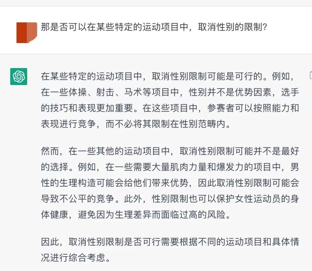 我的疑惑是,既然女性运动员并不输于男性运动员,那么为什么不能在一些比赛中取消性别的限制?实际上,Chatgpt也告诉我,一些诸如体操、射击以及马术等比赛,性别并非优势因素。以及一些包括围棋在内的智力运动本也不应该有性别之分,但如今这些项目却普遍有男女分别比赛的情况存在。