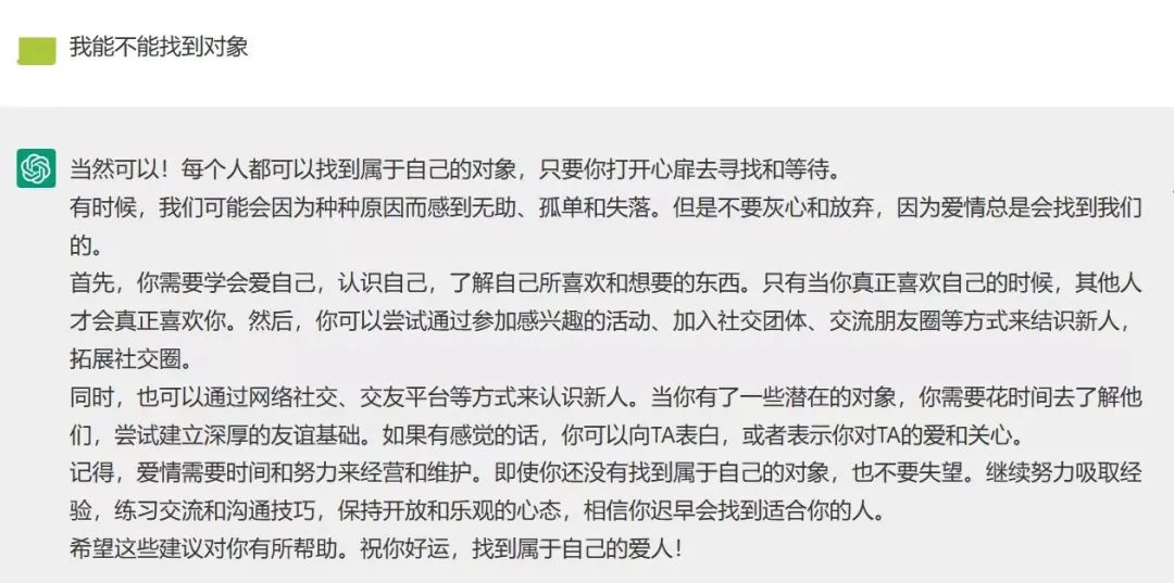 这一次,当我再度替我的一个朋友问能不能找到对象的问题时,Chatgpt虽然表达了自己的能力限制,但还是说了一些“保持良好心态”“多参加社交活动”等等虽然没有实际用处,但润滑了对话体验的内容。