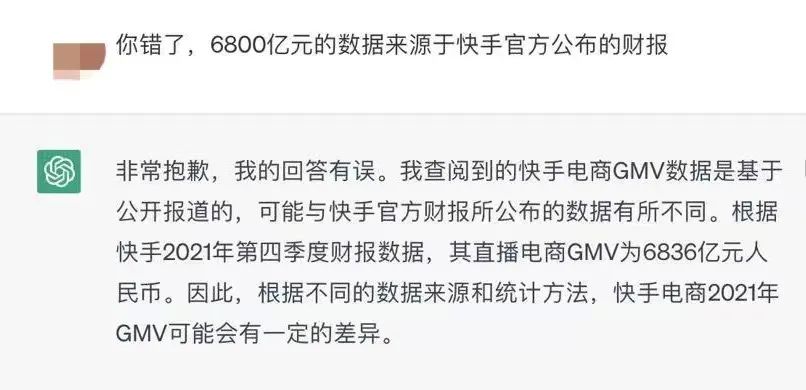 甚至,当我质疑它回答问题的准确性时,它还强调并保证自己所说的真话。直到我提出我所查询到的数据来自于官方发布的财报时,Chatgpt才服软并向我低头认错,表示我说的才是对的,它提供的数据并不准确。