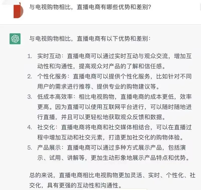 在这一阶段之前,我通过各种信息途径了解到,Chatgpt是一个需要不断训练的对话软件,它能够修正内容,且能够联系上下文回答问题。于是,我先让它对中国的直播电商行业进行一个综述,再问了一个许多用户都感兴趣的问题,“直播电商与电视购物有什么区别?”考验它的基本能力。
