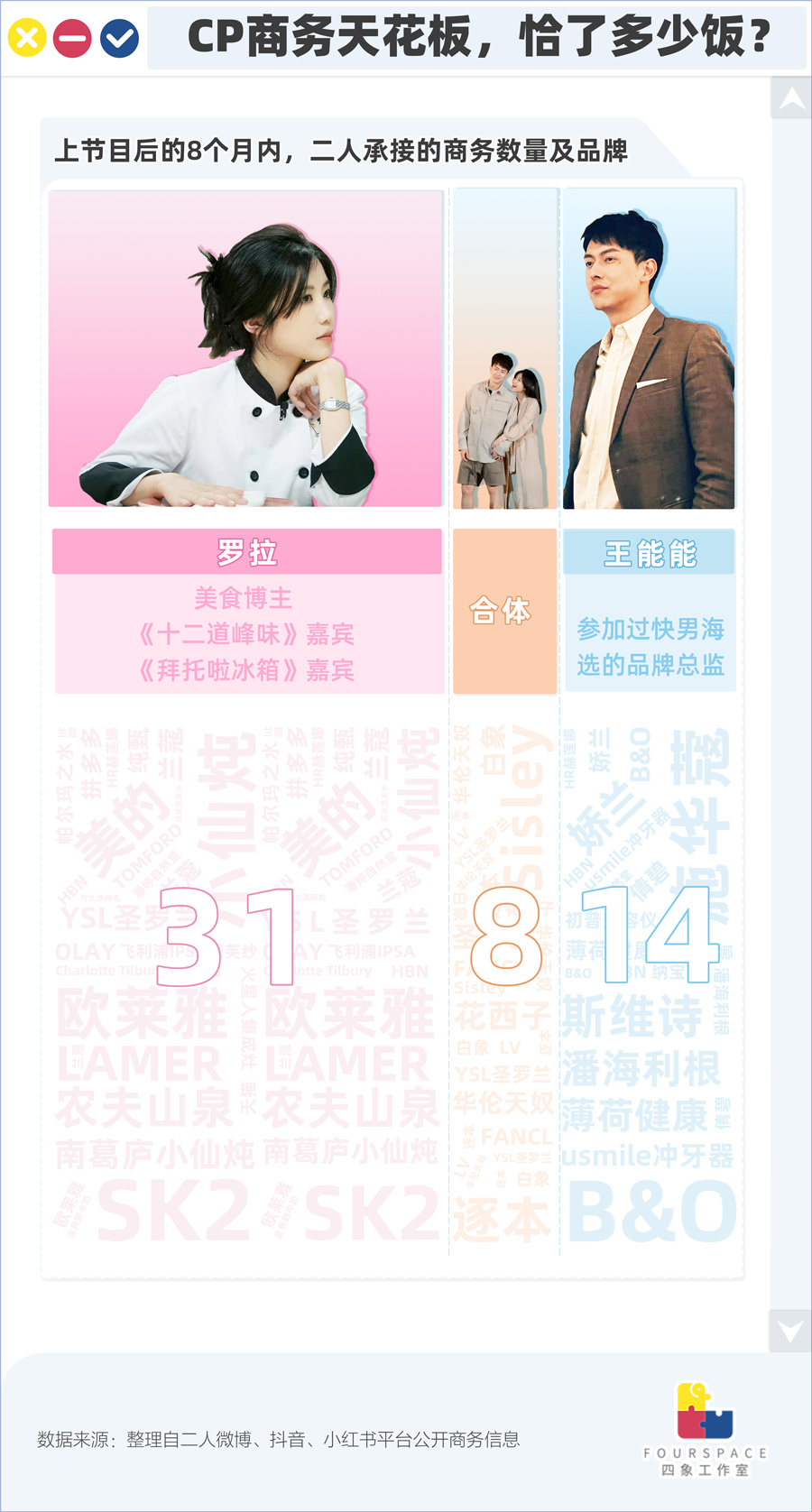 据媒体报道“方程式”、“快乐星球”等恋综CP的合体报价基本在30-50万;去年也曾有小红书某品牌公关称“巴啦啦能量”合体营业的报价已经超过7位数。同时据四象工作室统计在节目播出后的8个月内,罗拉和王能能接洽的商务也分别达到了31个和8个,合体营业也有8个。