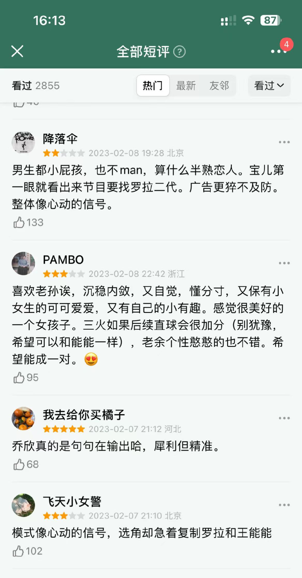 事实上,这也是整个恋综市场的缩影,综N代表现更为显著。《心动的信号》发展到第五季豆瓣打分人数已经不过万;《喜欢你我也是4》播出一月豆瓣仍未开分,在综艺上新潮中市场热度不断下滑。而如今大众所能想到的恋综代表性CP,也仍然停留在“奇闻CP”、“方程式CP”等上。
